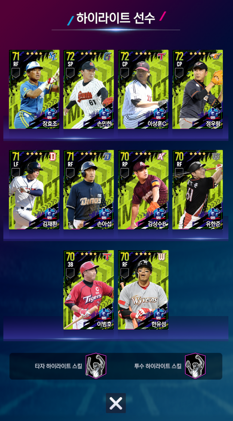 - 50회 구매마다 선택 구단의 하이라이트 임팩트 카드 1장을 확정적으로 획득할 수 있습니다.