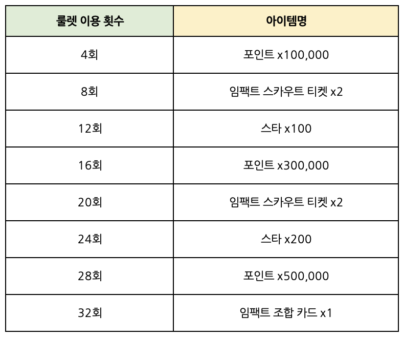 - 룰렛 이용 시 정해진 보상 중 1종을 확률에 따라 획득하실 수 있으며, 룰렛을 이용한 누적 횟수에 따라 추가 보상을 획득할 수 있습니다.