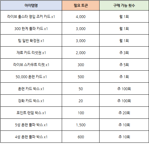 - 이벤트 토큰을 이벤트 상점에서 사용하여 라이브 올스타 영입 조커 카드, 한계 돌파 300카드 등 다양한 보상을 획득할 수 있습니다.