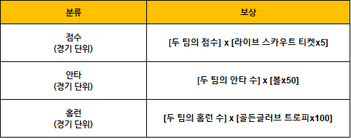 - 보상은 경기 종료 후 당일 순차적으로 지급될 예정이며 지급 후 7일 간 접속 시 수령하실 수 있습니다.