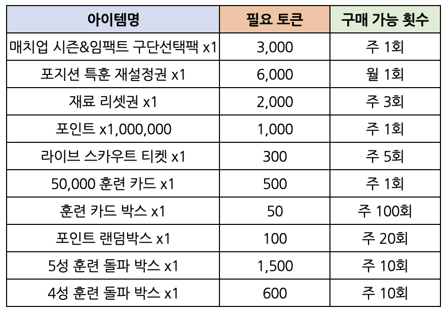 - 이벤트 토큰을 이벤트 상점에서 사용하여 매치업 시즌&임팩트 구단선택팩, 포지션 특훈 재설정권 등 다양한 보상을 획득할 수 있습니다.