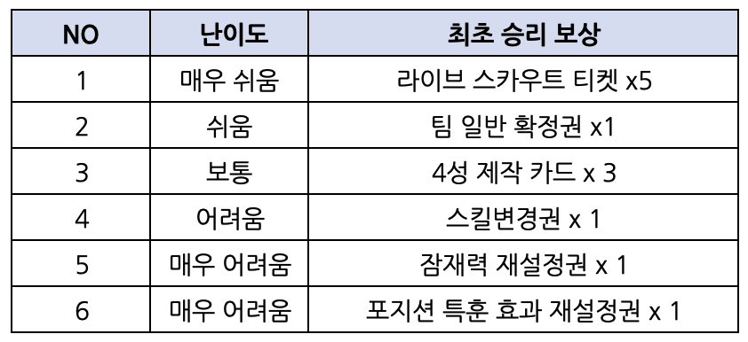 - 이벤트 기간 동안 6개 난이도로 구성된 스페셜 매치를 승리하여 최초 승리 보상과 이벤트 토큰을 획득하세요!