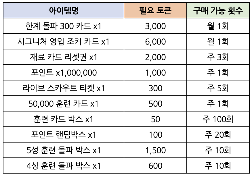 - 이벤트 토큰을 이벤트 상점에서 사용하여 시그니처 영입 조커 카드, 한계 돌파 300카드 등 다양한 보상을 획득할 수 있습니다.