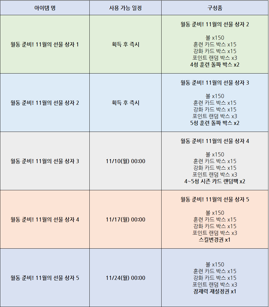 - 이후 11월의 월요일 마다 추가 사용이 가능하며 5성 훈련 돌파 박스, 4성 훈련 돌파 박스, 잠재력 재설정권 등의 보상을 획득 하실 수 있습니다!