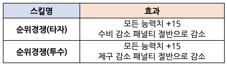 - 타자와 투수가 각각 메이저 스킬 중 순위경쟁(타자/투수) 스킬을 보유하고 있다면, 패널티 수치가 감소되기에