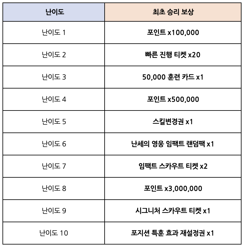 - 상위 난이도 경기는 이전 난이도 승리한 상태라면 인게임에 기재된 날짜부터 이용이 가능합니다.