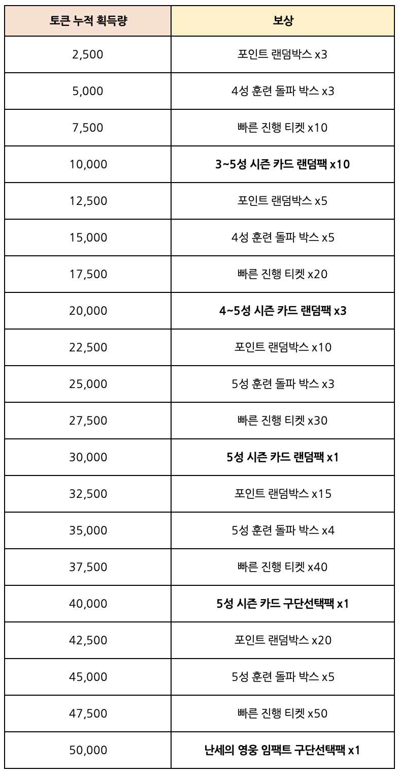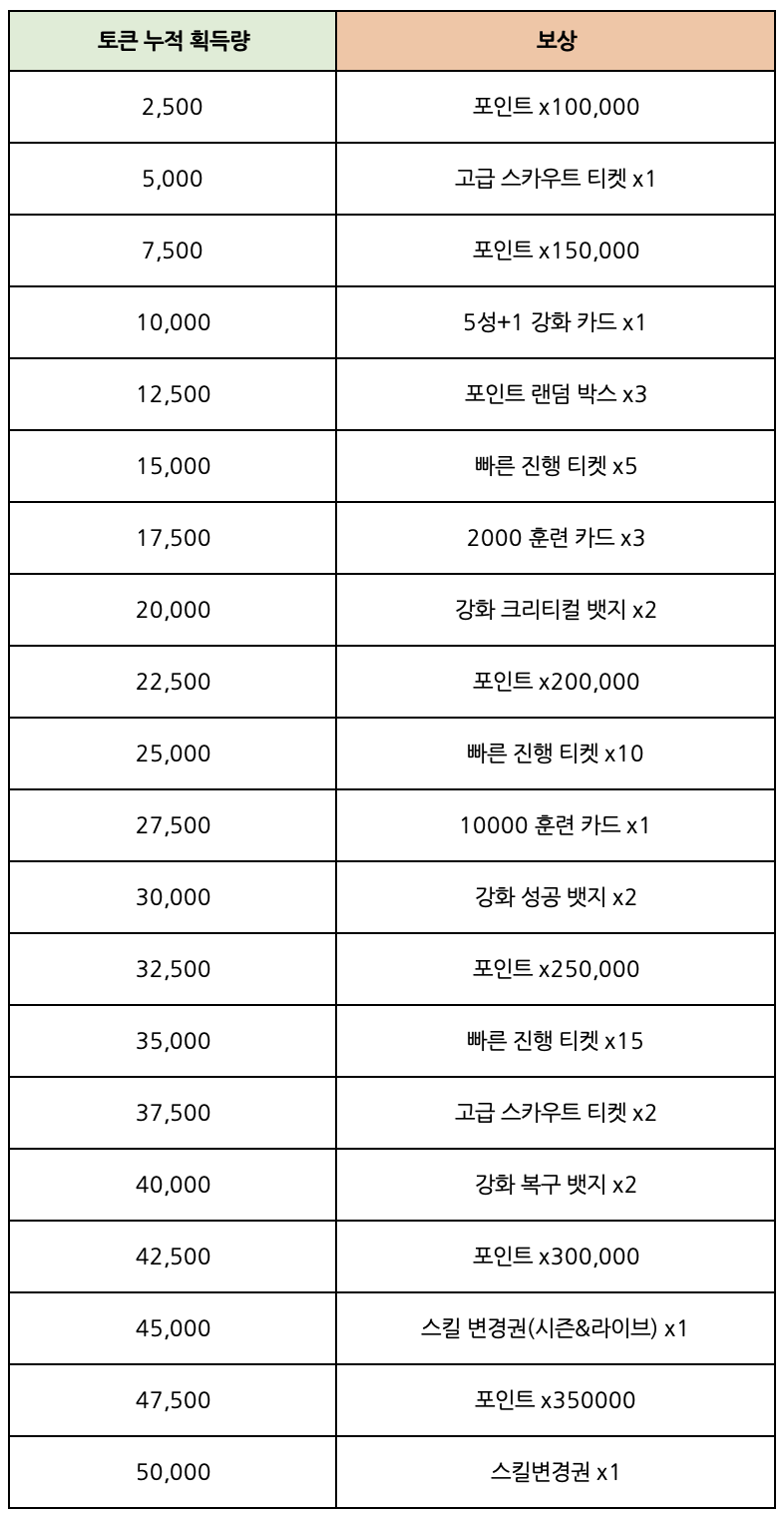 - 경기 당 획득할 수 있는 이벤트 토큰의 양은 각 난이도 별 기본 보상과 점수 차 추가 보상, 그리고 직접 플레이 추가 보상이 모두 합쳐서 획득하게 됩니다.