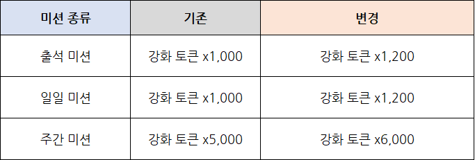 ※ [출석 미션], [일일 미션]으로 획득하는 강화 토큰 수량이 증가하였습니다.