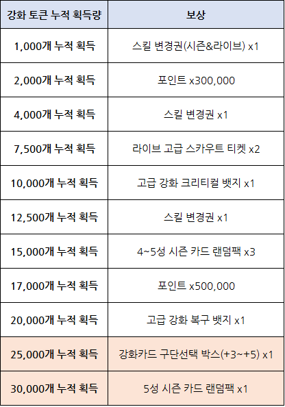 ※ 25,000개 누적 획득, 30,000개 누적 획득 보상이 추가되었습니다.
