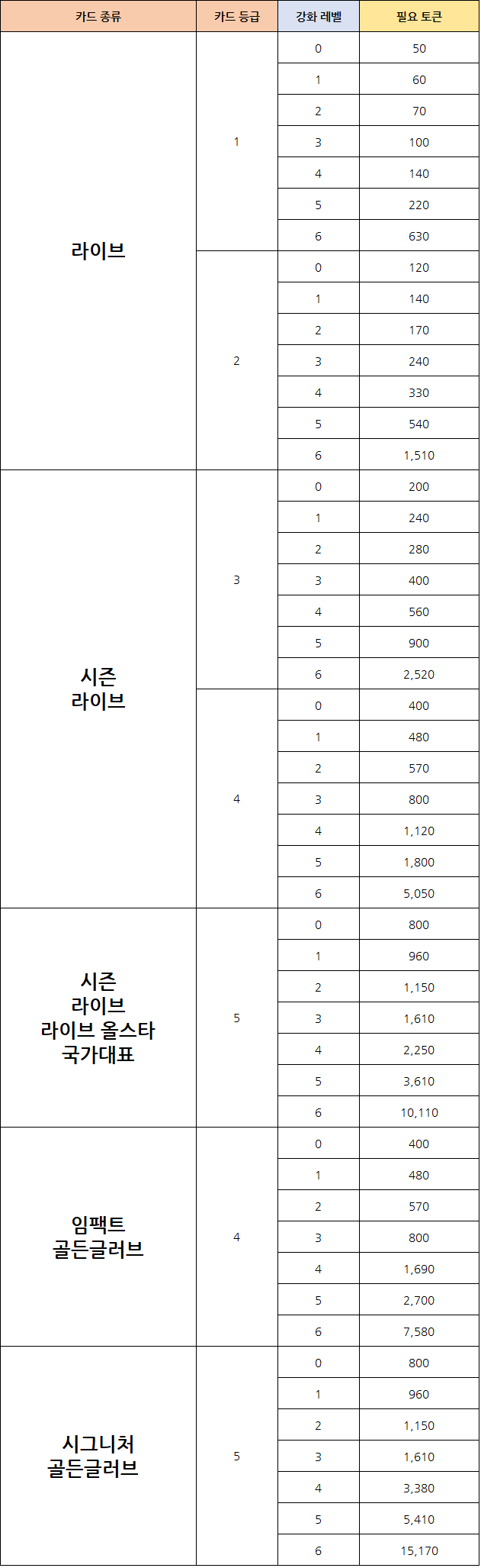 [카드 종류 및 등급에 따른 필요 강화 토큰 수량]