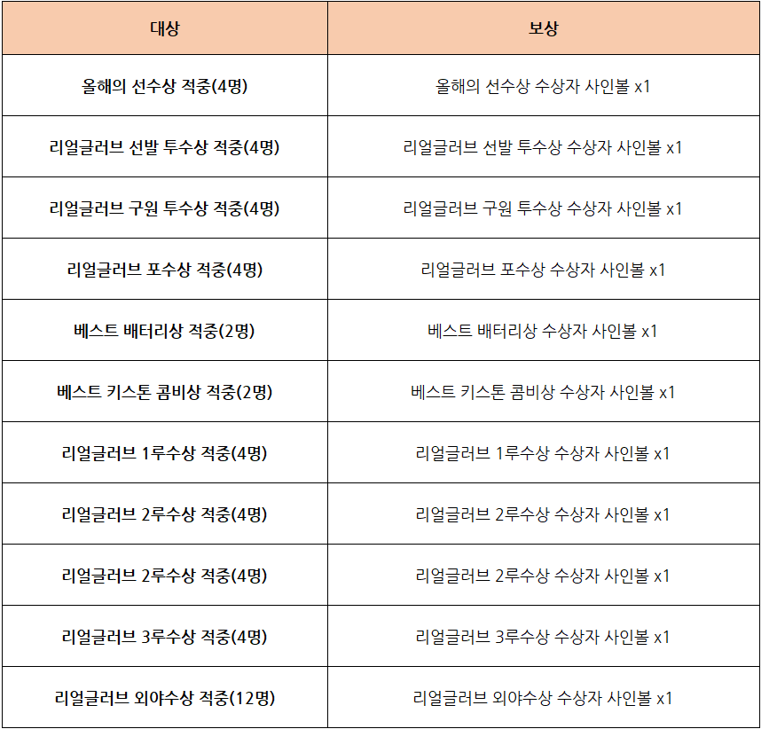 * 리얼글러브 외야수상 예측의 경우 1명 이상 예측 적중 후 추첨 되실 경우 적중된 선수 중 랜덤으로 사인볼이 지급됩니다.