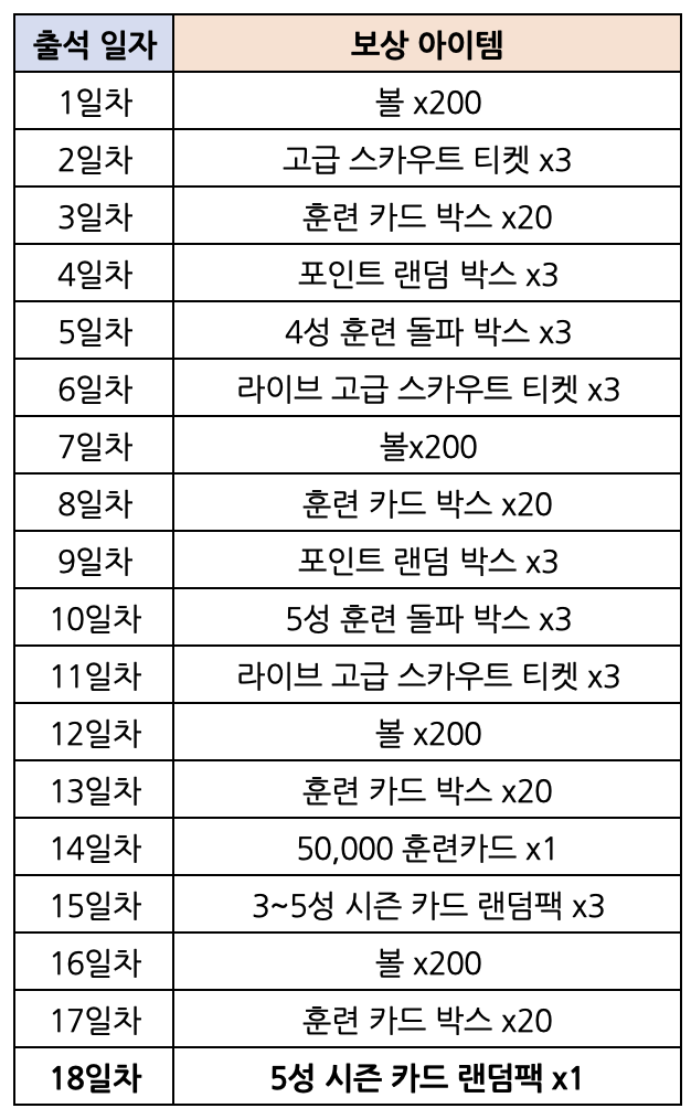 ※ 이벤트 기간 동안 18일 출석 시, 모든 선물을 획득할 수 있습니다.