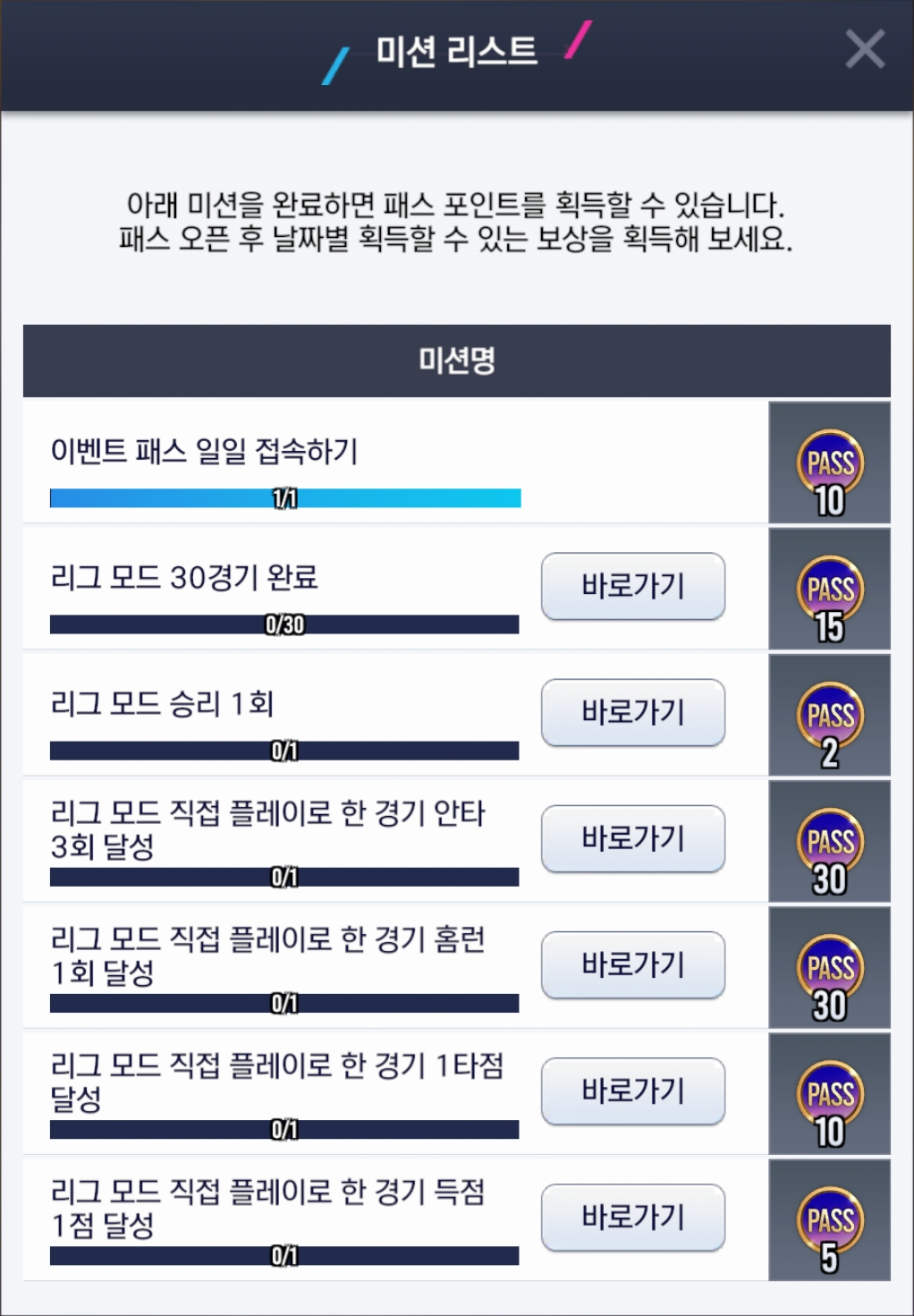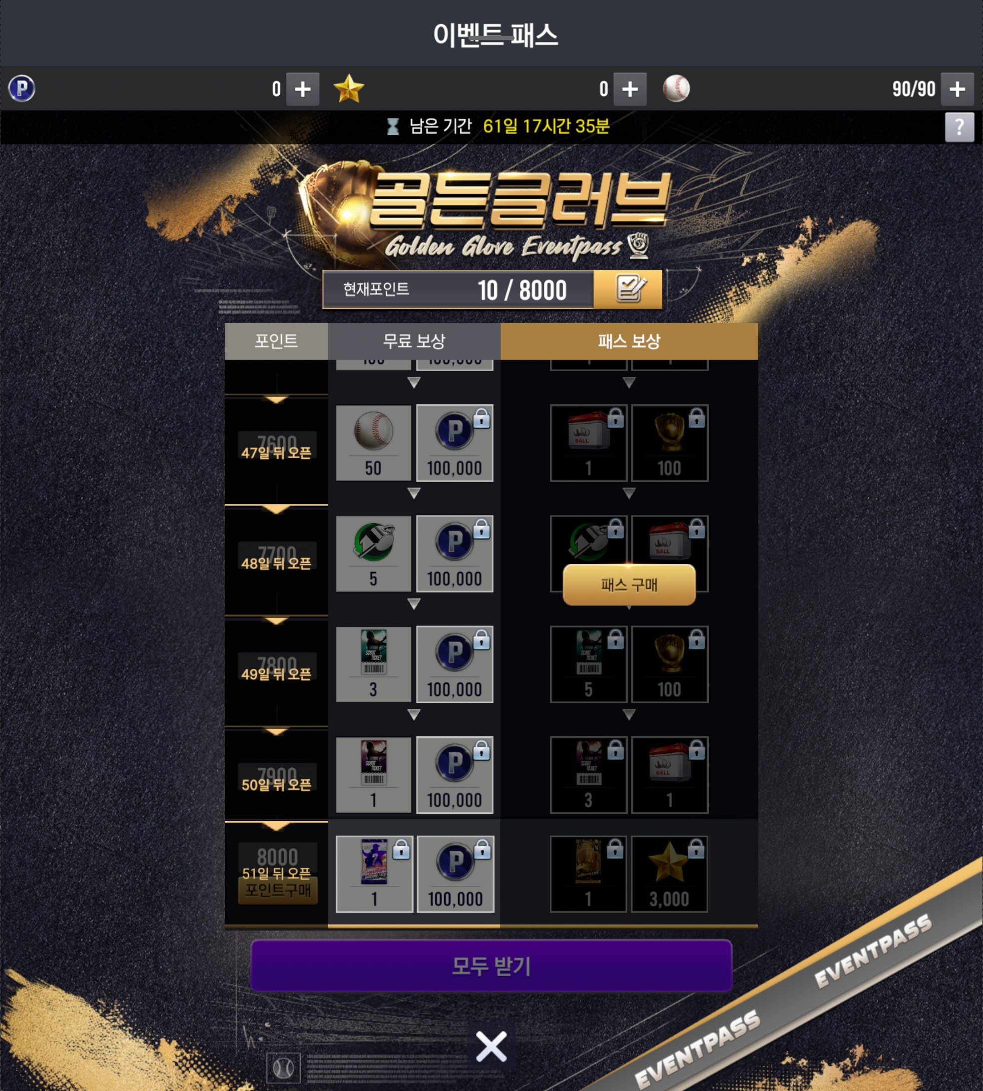 ▶ 골든글러브 이벤트 패스 [패스 포인트] 획득 미션 리스트