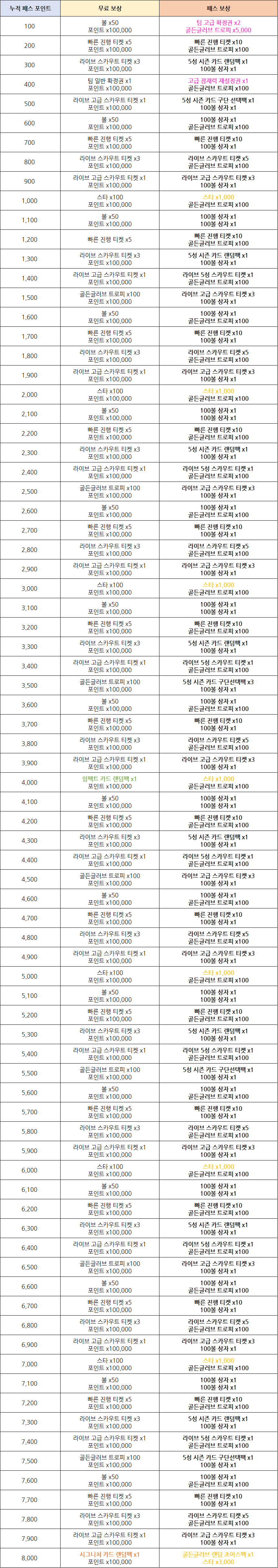 ▶ 누적 패스 포인트에 따라 획득 가능한 보상 리스트