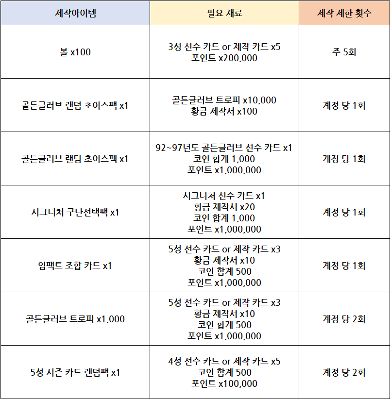 * 18차 업데이트 이후 진행되는 골든글러브 출시 기념 스페셜 매치에서 [황금 제작서 50개]를 획득할 수 있으며