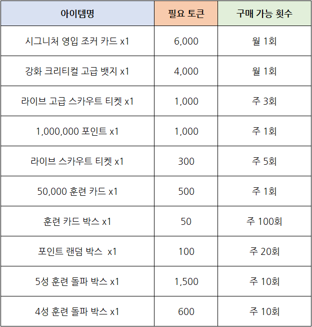 시그니처 영입 조커 카드, 훈련 성장 재설정권,강화 크리티컬 뱃지 등을