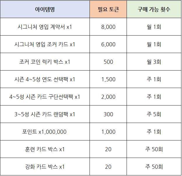 - 이벤트 코인을 이벤트 상점에서 사용하여 시그니처 영입 계약서, 시그니처 영입 조커 카드, 조커 코인 럭키 박스 등 다양한 보상을 획득할 수 있습니다.