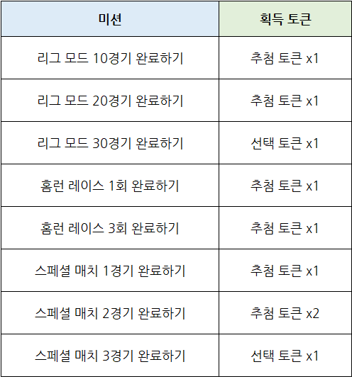- 매일마다 8개의 미션을 클리어하고, 각 미션에 따라 [추첨 토큰] 과 [선택 토큰]을 획득합니다.