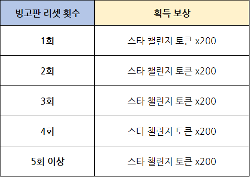 - 새로운 빙고판으로 교체 시, 빙고판 리셋 횟수에 따라 추가로 [스타 챌린지 토큰]를 획득할 수 있습니다.