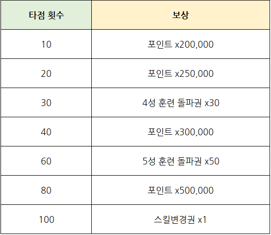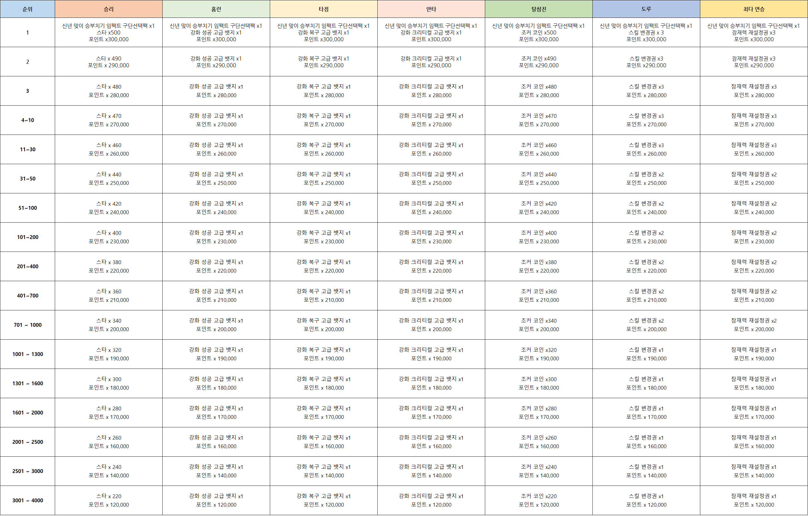 EX) 승리 1위, 홈런 11~30위 달성 시 각 순위에 맞는 보상 획득