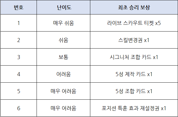 - 상위 난이도 경기는 이전 난이도 승리한 상태라면 인게임에 기재된 날짜부터 이용이 가능합니다.