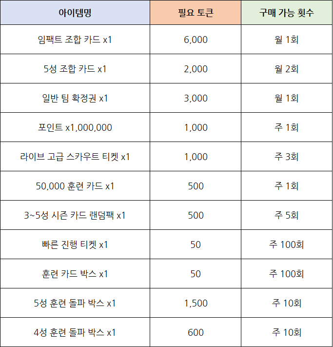 임팩트 조합 카드, 시그니처 조합 카드, 5성 조합 카드, 라이브 스카우트 티켓 등