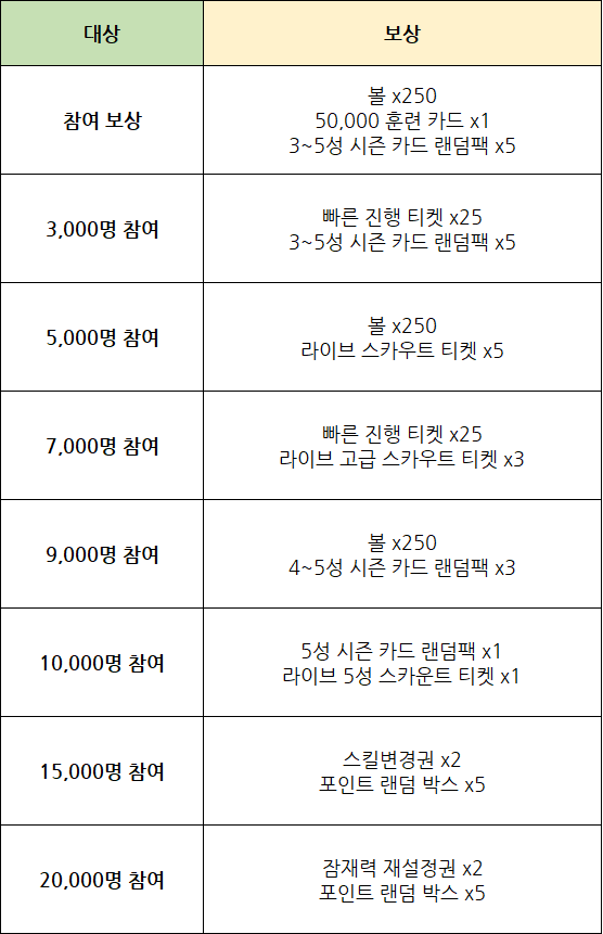 - 참여해주신 모든 구단주 분들께 참여 보상과 참여 인원에 따른 추가 보상을 드립니다!