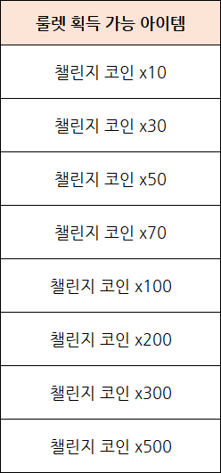 - 매일 이벤트 미션을 달성하고 룰렛을 돌려 챌린지 코인을 획득할 수 있습니다.