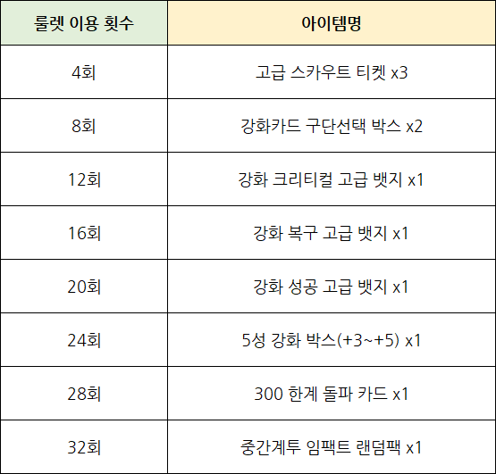 - 룰렛 이용 시 정해진 보상 중 1종을 확률에 따라 획득하실 수 있으며, 룰렛을 이용한 누적 횟수에 따라 추가 보상을 획득할 수 있습니다.