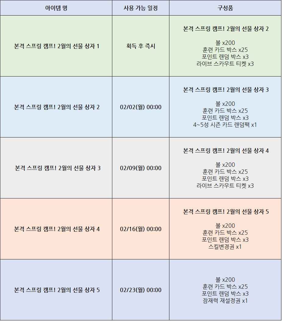 - 이벤트 기간 동안 게임에 접속 시 우편함에 [본격 스프링 캠프! 2월의 선물 상자]을 획득하실 수 있으며 상자에서 다양한 보상들을 획득 하실 수 있습니다!