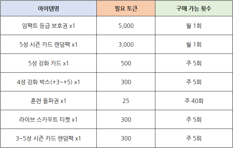 - 이벤트 코인을 이벤트 상점에서 사용하여 임팩트 등급 보호권, 5성 시즌 카드 랜덤팩, 5성 강화 카드 등 다양한 보상을 획득할 수 있습니다.