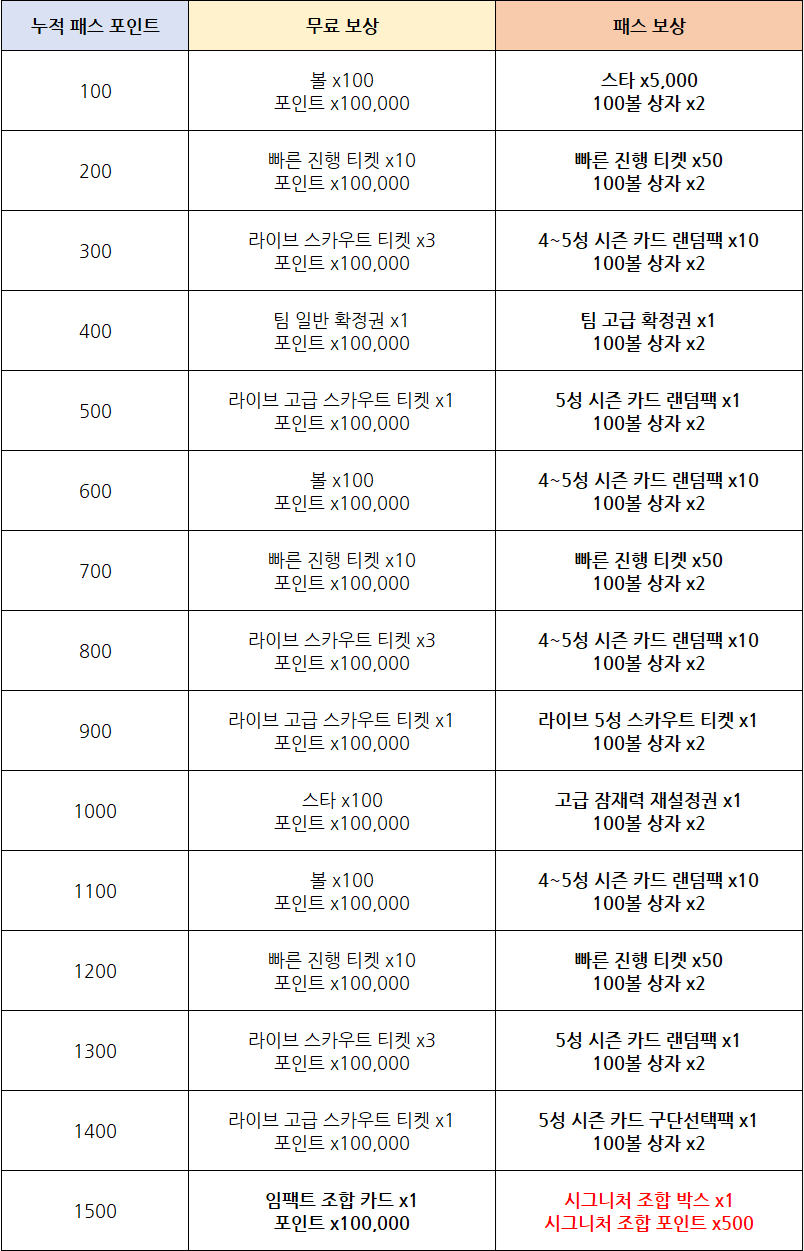 ▶ 누적 패스 포인트에 따라 획득 가능한 보상 리스트