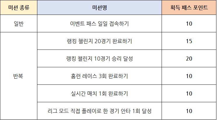 * 이벤트 패스 접속하기 미션 외 미션들은 모두 반복적으로 완료가 가능합니다.