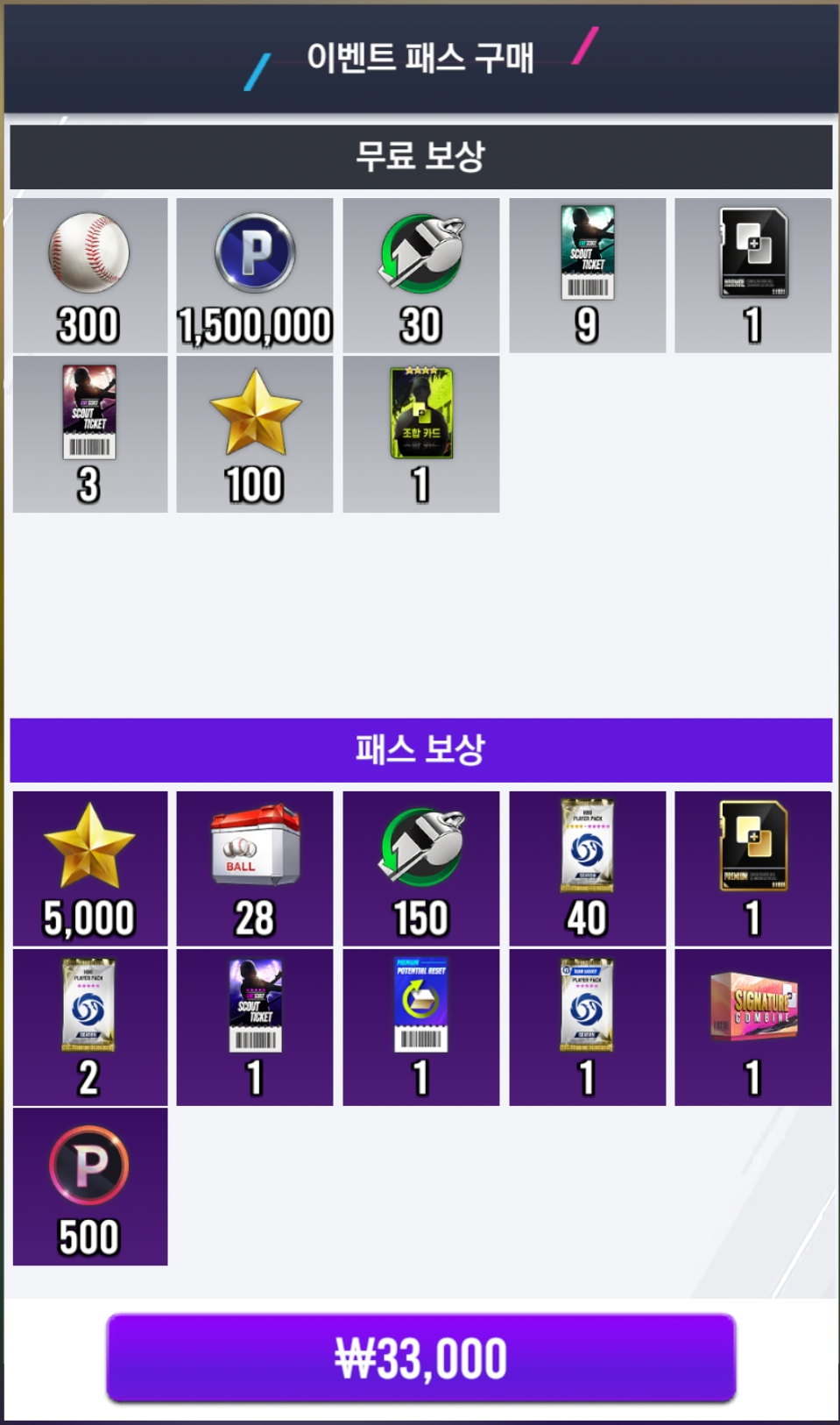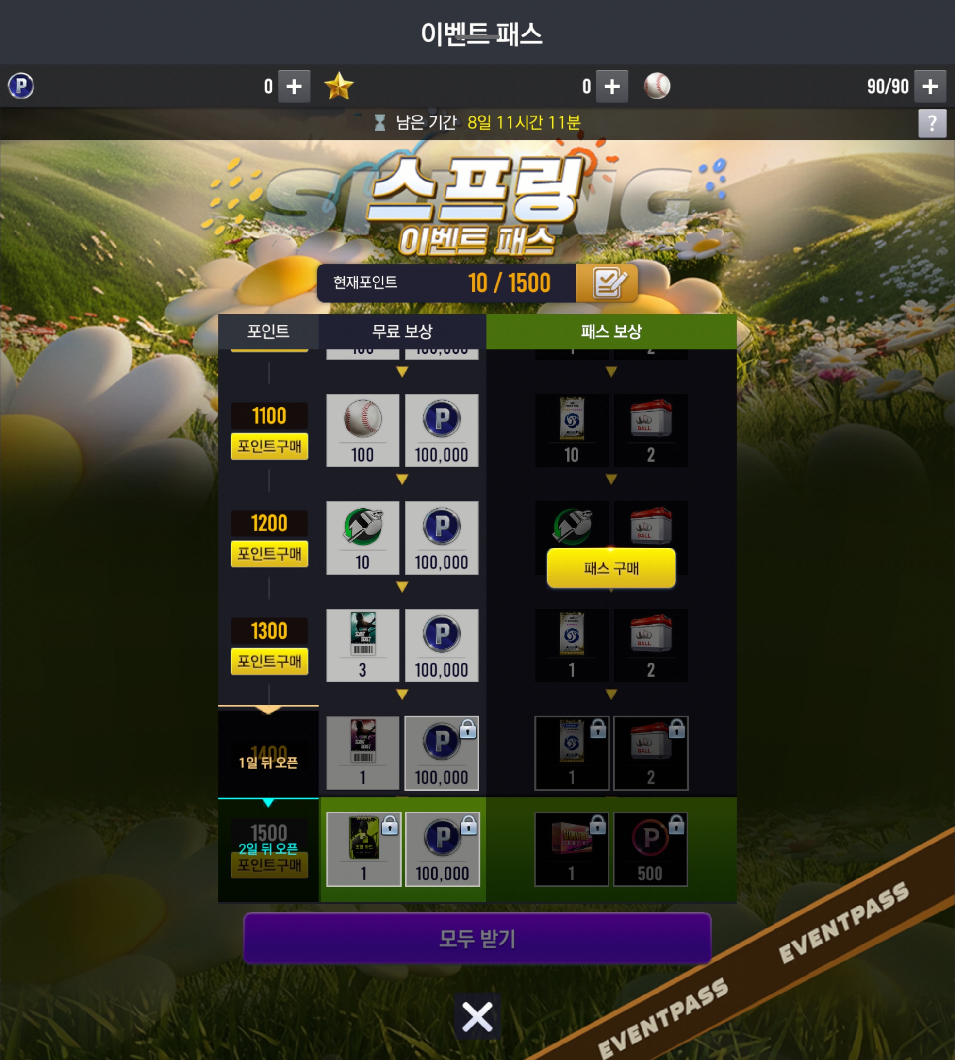 - 패스를 구매 시, 이전에 달성한 패스 포인트에 해당하는 패스 보상(유료)도 모두 수령 가능합니다.