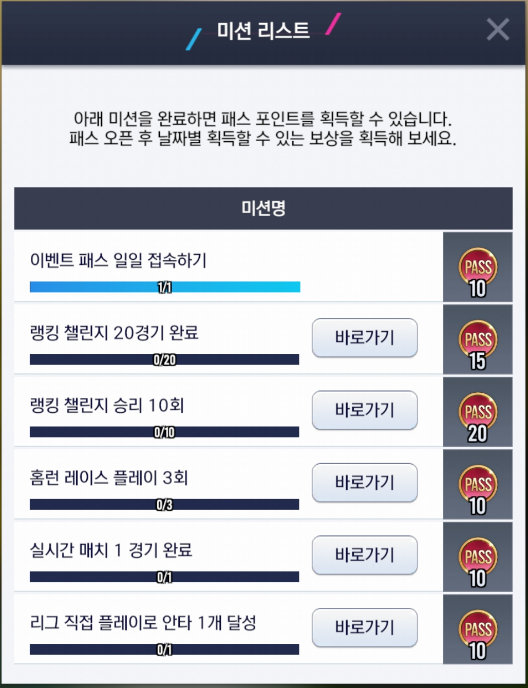* 미션을 통해 하루 최대 100 패스 포인트를 획득할 수 있습니다.