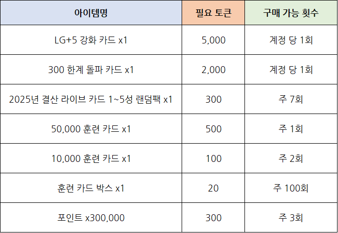 - 이벤트 코인을 이벤트 상점에서 사용하여 LG+5 강화 카드, 300 한계 돌파 카드, 2025년 결산 라이브 카드 1~5성 랜덤팩 등 다양한 보상을 획득할 수 있습니다.