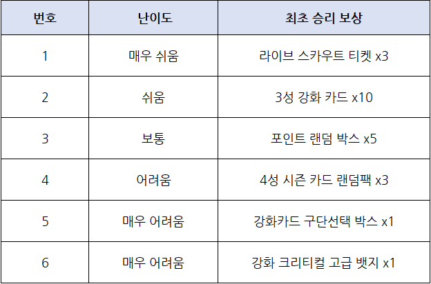- 상위 난이도 경기는 이전 난이도 승리한 상태라면 인게임에 기재된 날짜부터 이용이 가능합니다.