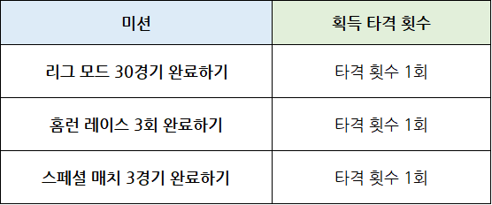 - 미션을 달성할 때마다 미니 야구게임 타격 기회가 매일 최대 3회까지 주어집니다.