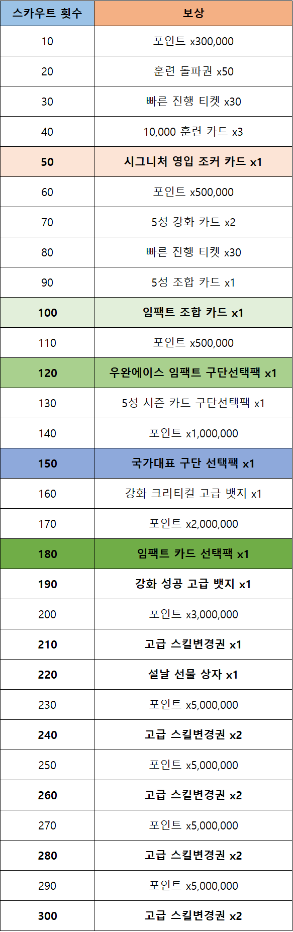* 설날 기념! 특별 스카우트는 아래와 같은 선수 카드 획득 확률로 제공됩니다.