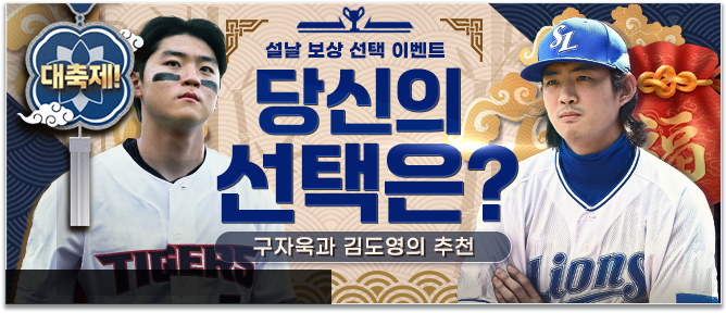 - 설날을 맞이하여 매일 새롭게 주어지는 미션을 수행하면 구자욱 선수와 김도영 선수가 각각 보상을 추천해드립니다!