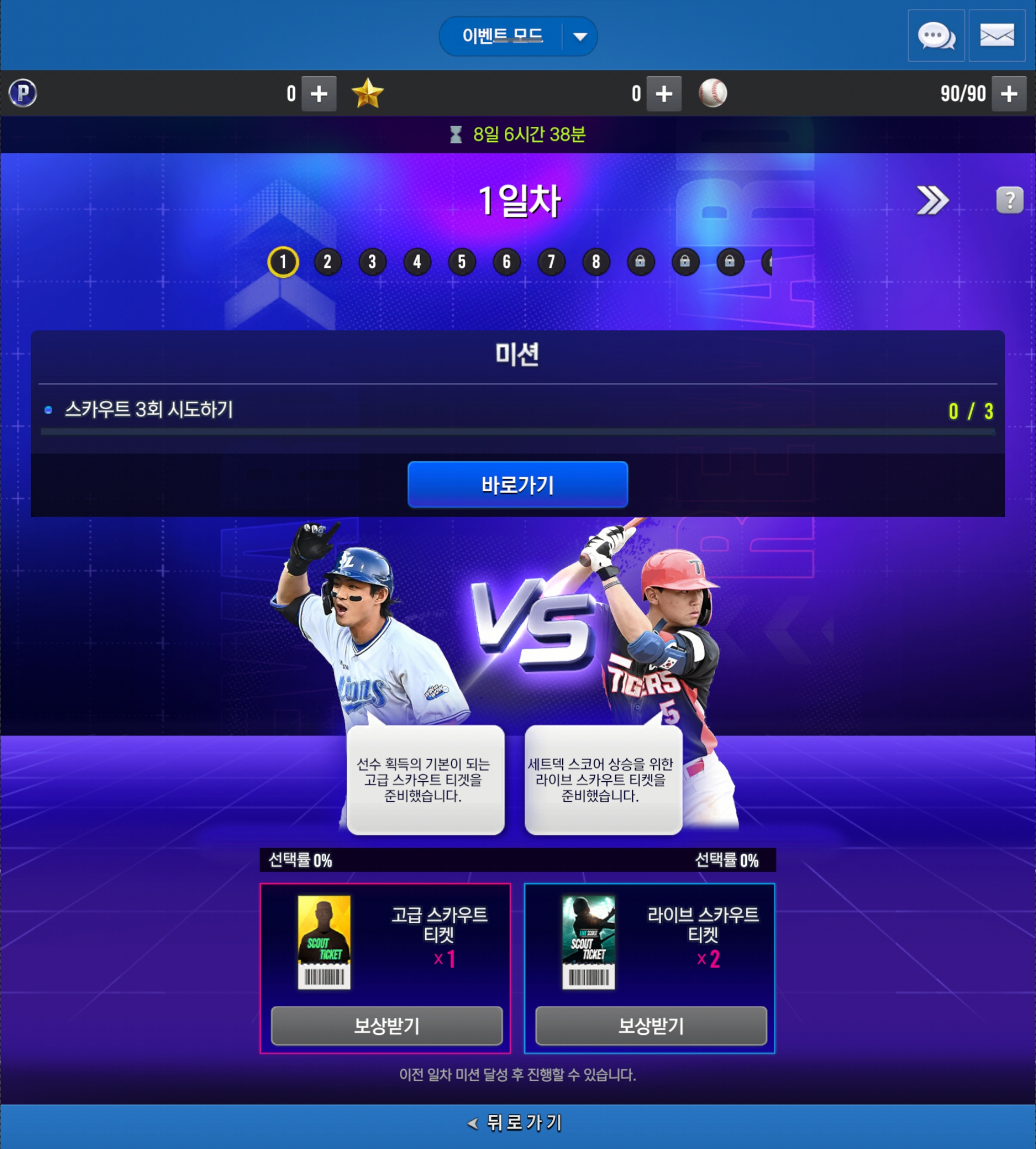 스카우트를 진행하고 스카우트 횟수에 따라 우완에이스 임팩트 구단선택팩을 비롯하여