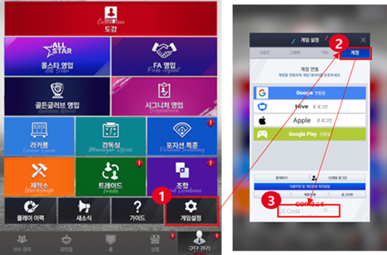 - [게임 설정] → 계정 화면에서 CS 코드(CS Code : 000000)를 확인하실 수 있습니다.