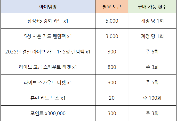 - 이벤트 코인을 이벤트 상점에서 사용하여 삼성+5 강화 카드, 5성 시즌 카드 랜덤팩, 2025년 결산 라이브 카드 1~5성 랜덤팩 등 다양한 보상을 획득할 수 있습니다.