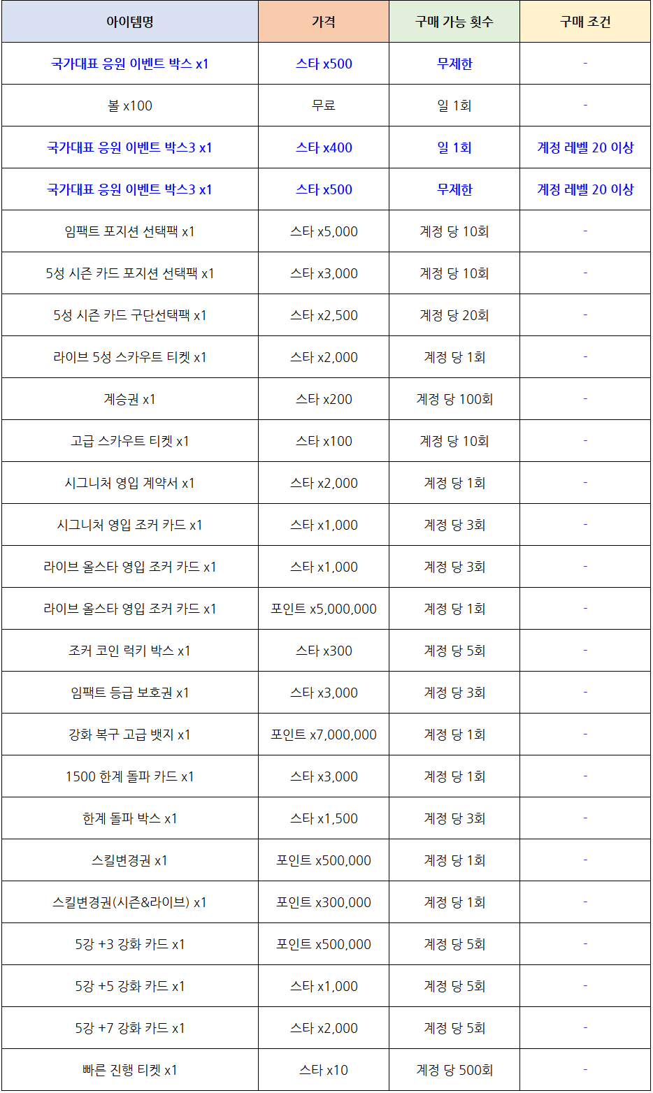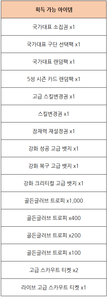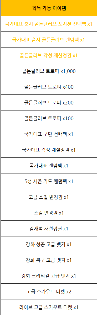 - 국가대표 응원 이벤트 박스 사용 시 국가대표 소집권, 국가대표 구단 선택팩, 국가대표 랜덤팩,