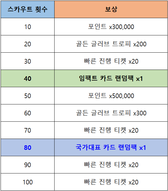 임팩트 카드 랜덤팩과 국가대표 카드 랜덤팩 등 다양한 보상을 획득하실 수 있는