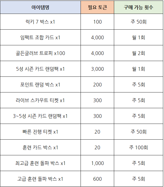 - 획특한 이벤트 토큰을 이벤트 상점에서 사용하여 임팩트 조합 카드, 골든글러브 트로피, 럭키 7 박스 등 다양한 보상을 획득할 수 있습니다.