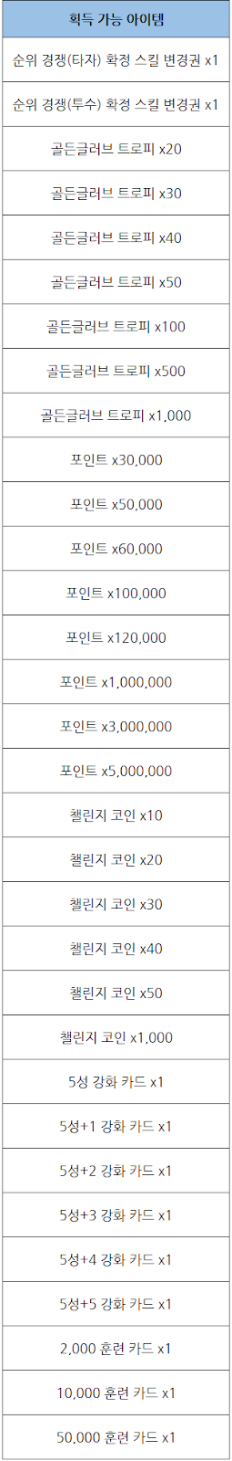 순위 경쟁 확정 스킬변경권을 획득할 수 있는 럭키 7 박스까지 다양한 보상을 획득하세요!