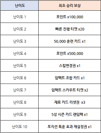 - 각 난이도 최초 승리 시 최초 승리 보상으로 임팩트 조합 카드, 포지션 특훈 효과 재설정권 등을 획득 하실 수 있습니다.