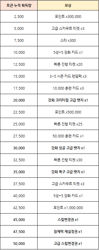 - 최초 누적 보상을 통하여 잠재력 재설정권, 강화 복구 고급 뱃지, 고급 스킬변경권 등을 획득 하실 수 있습니다.