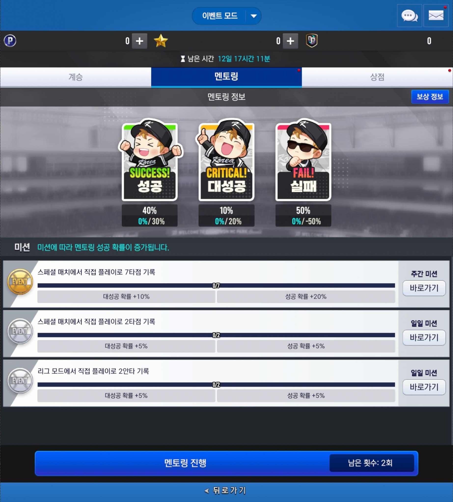 주간 미션과 일일 미션 진행 시 멘토링 성공/대성공 확률이 증가하며,
